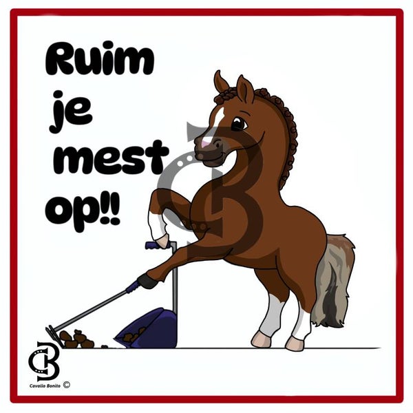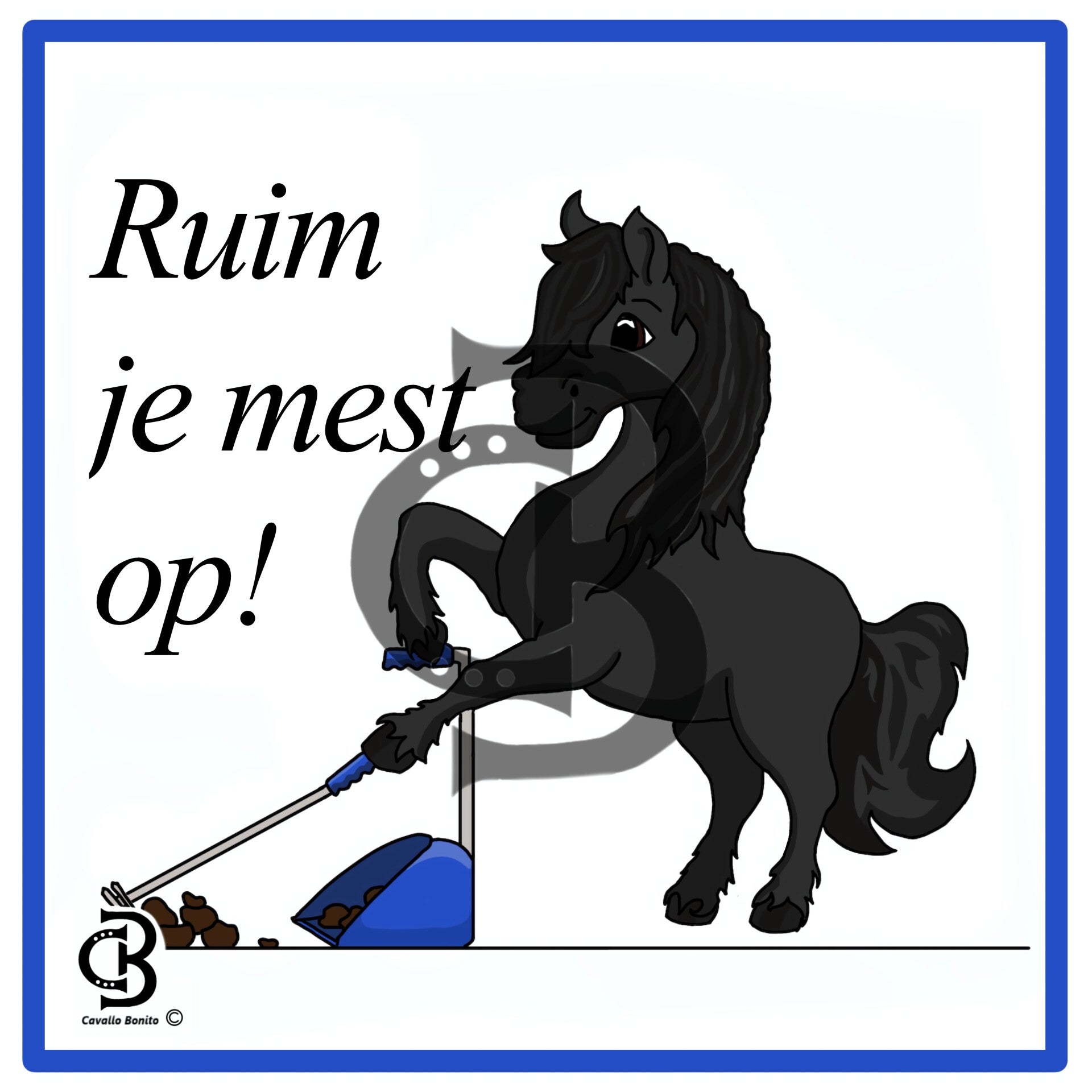 Dit bordje kun je overal hangen bij de rijbak, poetsplaats, longeerpiste, paddocks en in de gang. Overal waar iemand mest laat liggen is een irritatie. Met deze bordjes help je iedereen er weer even aan te herinneren om de mest van hun paard/ pony op te ruimen.